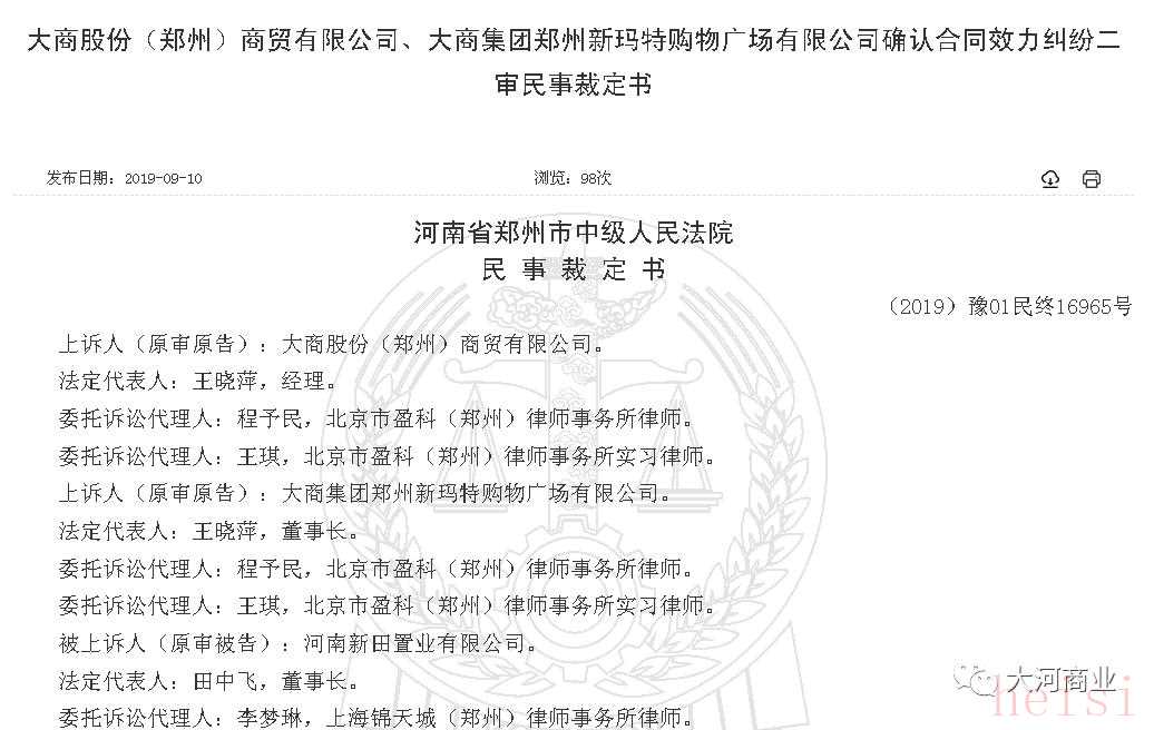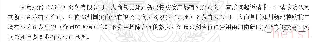 大商郑州地区集团目前的招牌店大商新玛特郑州国贸总店,在面临品牌资源不足、盈利上涨乏力的同时,也因拖欠租金问题收到了业主方的解除合同通知书。据(2019)豫01民终16965号河南省郑州市中级人民法院民事裁定书内容显示,河南新田置业有限公司、河南郑州国贸商业有限公司向大商股份(郑州)商贸有限公司、大商集团郑州新玛特购物广场有限公司发出解除合同通知书,并于2019年5月20日向郑州仲裁委员会申请仲裁,郑州仲裁委员会已经受理,现已裁决。大商股份(郑州)商贸有限公司、大商集团郑州新玛特购物广场有限公司提出上诉,经郑州市中级人民法院二审裁定,驳回上诉。现在也处于尴尬的经营困局。