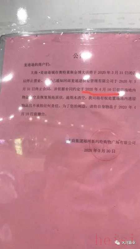 同时,还贴出了一张针对麦迪逊商户的公告,公告显示:“我司已通知河南麦迪逊商业管理有限公司于2020年3月31日终止合同,并依据合同约定于2020年4月5日前将场地内物品清空及恢复场地原状”,随后,在街道办事处的协调下,修改为“依据合同约定于2020年4月10日前将场地内物品清空及恢复场地原状”,并重新张贴公告。