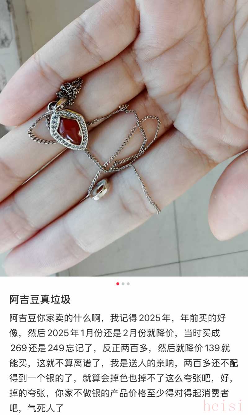 “2025年贵金属饰品监督抽查不合格情况表”还披露了上海阿吉豆实业发展有限公司销售的“AJIDOU”牌925银耳环、上海凌飞珠宝有限公司销售的“FLOWER GIRL”牌925银戒指、上海裕汇珠宝有限公司销售的“中国金行”牌925银挂件存在质量不合格问题。其中阿吉豆是国内知名时尚配饰品牌,公开资料显示,截至2025年10月,阿吉豆终端直营门店超600家,覆盖全国150余个城市。南都N视频记者发现,在小红书上,不少网友亦指出该品牌银饰存在“做工差”“褪色快”等质量问题。