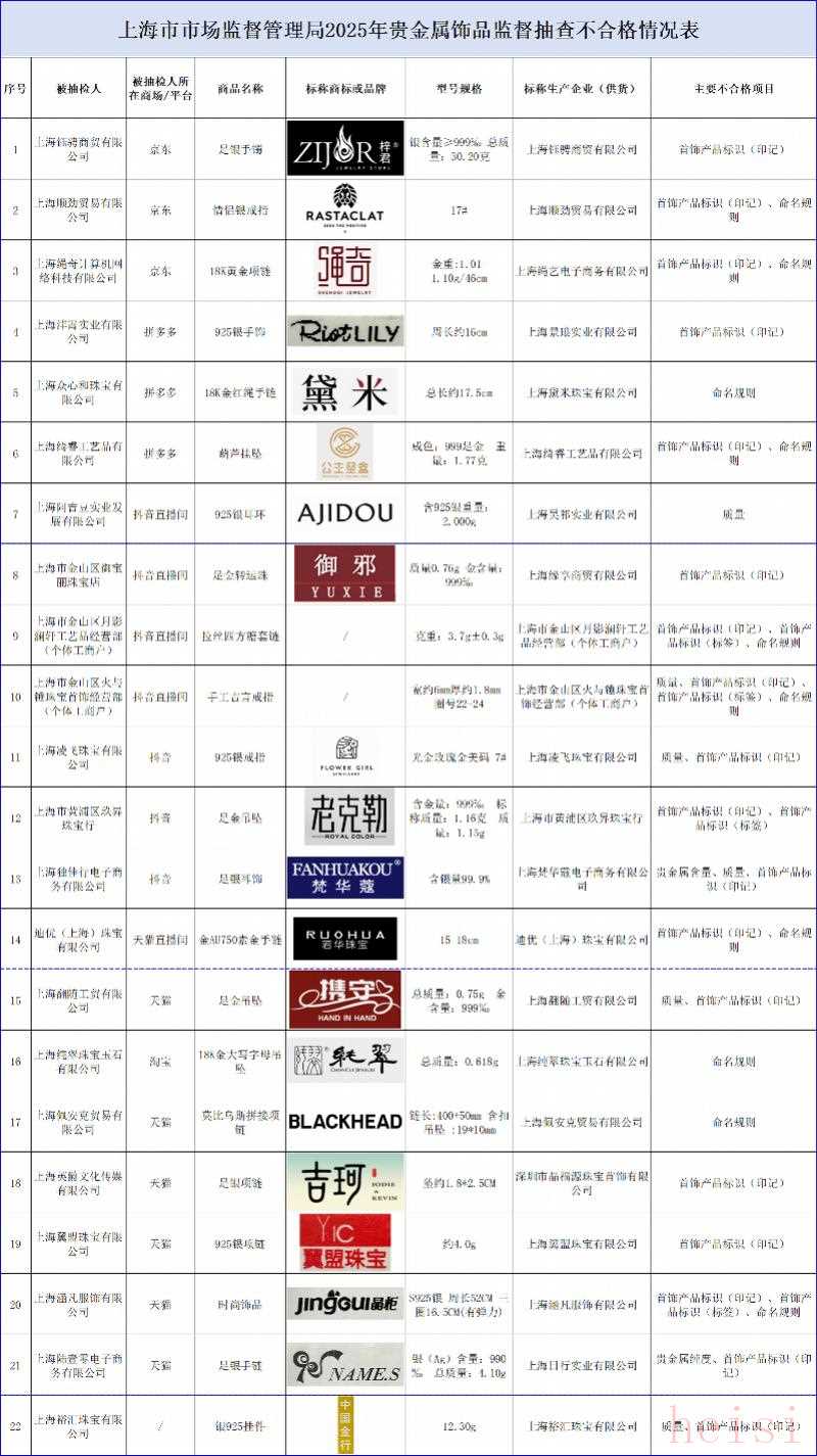 据“上海市场监管”微信公众号10月16日发布,针对消费者投诉、举报集中及质量问题较多的产品,近期,上海市市场监督管理局集中组织力量对上海宝山、嘉定、金山等5个区以及5家网络平台、2家直播间56家企业销售的51个品牌60批次贵金属饰品进行了监督抽查。经检测,有22批次不合格(其中直播间5批次),不合格检出率为36.7%。检测项目涉及贵金属含量、贵金属纯度、质量、首饰产品标识和命名规则。