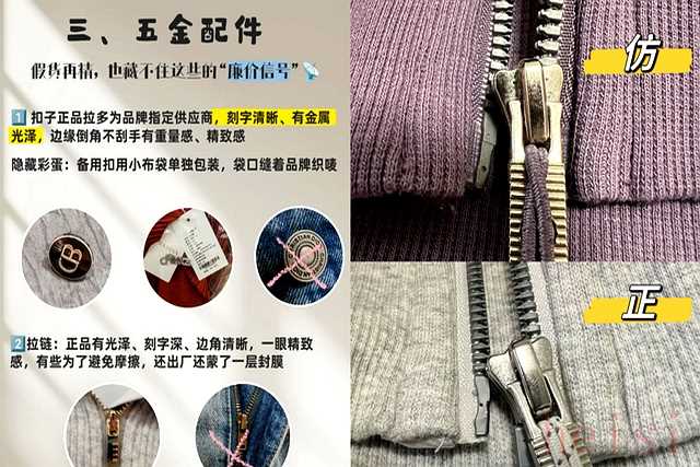 第三招,检查五金配件。像拉链、纽扣、金属搭扣这些小零件,最能体现品牌的用心程度。正品的五金件通常是开模定制的,上面会刻有品牌logo,质感厚重,表面光滑。拉链拉起来顺滑流畅,不会卡顿。而假货的五金件往往是通用货,轻飘飘的,表面有划痕或镀层不均,拉链也容易卡顿、掉色。