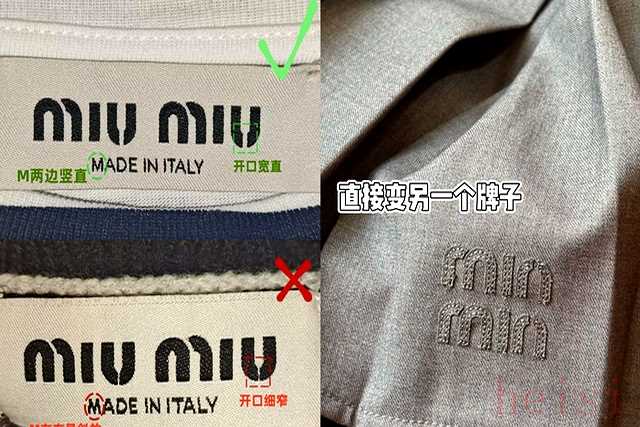 最让人哭笑不得的是,很多仿品连最基本的logo都抄不对。正品的MiuMiu字母圆润饱满,间距均匀,而有些山寨货直接变成了“minmin”或者“mimi”,甚至字母变形,一眼就能看出问题。穿这种衣服出门,简直是行走的尴尬现场,别人不说,自己心里也发虚。