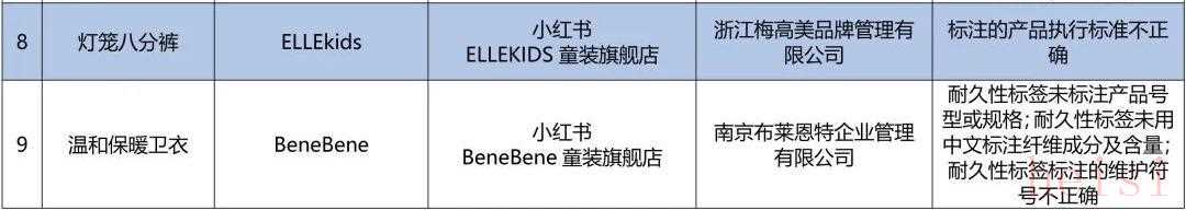 结果显示,1件标称在小红书ELLEKIDS童装旗舰店购买的,浙江梅高美品牌管理有限公司的“ELLEkids”灯笼八分裤,被检出标注的产品执行标准不正确。