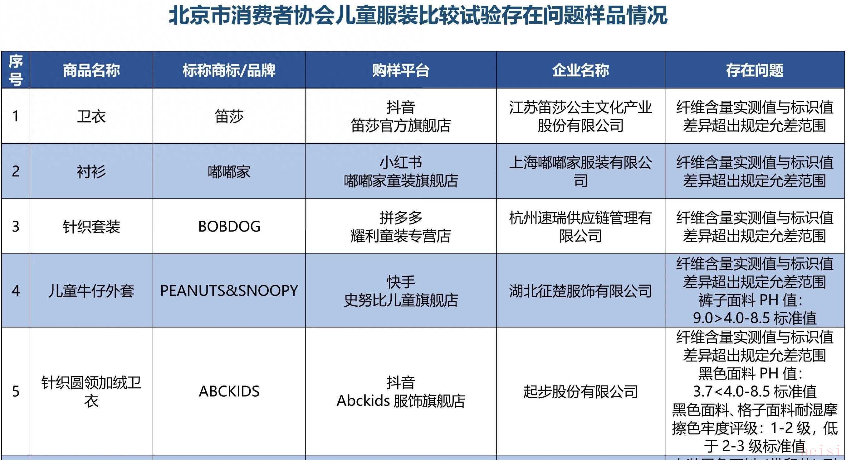 同样在纤维含量项目上出现问题的还包括,ABCKIDS、PEANUTS&SNOOPY、BOBDOG等品牌的童装产品。