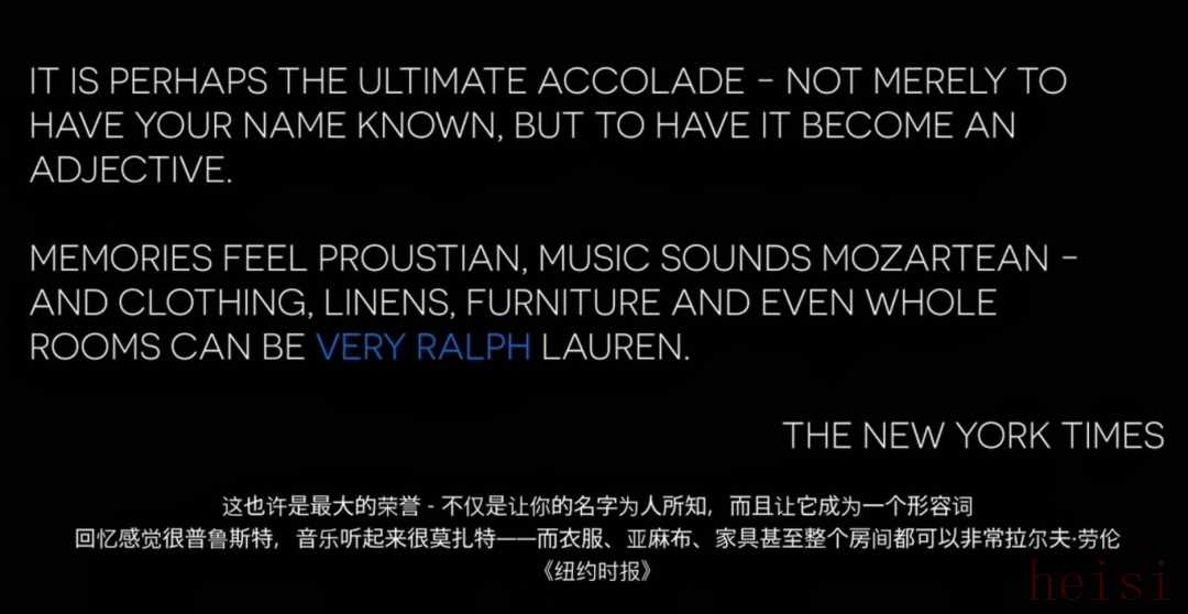 在时尚界,“Very Ralph”也已经成为一种生活方式的代名词,它代表着体面、经典、努力实现美好生活。《纽约时报》曾发表评论说:“这也许是最大的荣誉——不仅是让你的名字为人所知,而且让它成为一个形容词。”就像一段回忆可以让人感觉很普鲁斯特,一段音乐可以听起来很莫扎特,而对于衣服、亚麻布、家具甚至是整个房间,人们都可以说它“Very Ralph”。