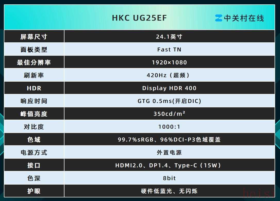 1、24.1英寸电竞黄金尺寸,进阶FPS高手优选;HKC UG25EF采用了一块24.1英寸的FastTN面板,支持FHD@420Hz的疾速高刷,搭配低至0.5ms的GTG响应时间,游戏画面更顺畅,玩家能够尽情享受冲击力十足的游戏画面。