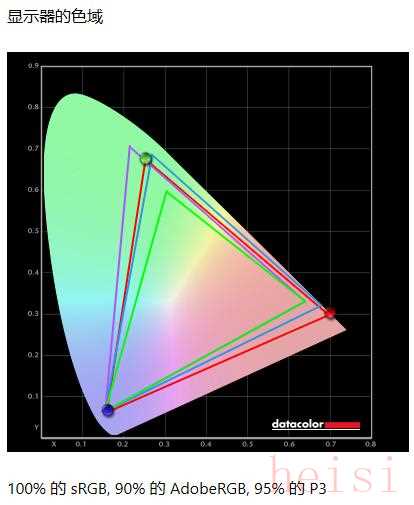 首先是色域测试,根据SpyderXElite软件的测试结果显示,HKC UG25EF显示器sRGB色域的覆盖度为100%,AdobeRGB色域的覆盖度为90%,P3色域的覆盖度为95%,考虑到官方实测P3色域是基于CIE1976,其实测表现已然达到或接近官方宣传水平。