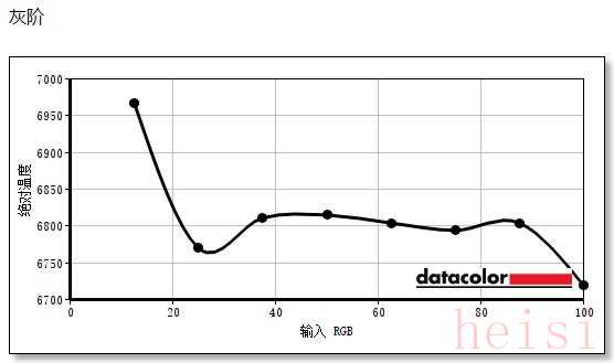 灰阶方面,显示器在全亮度下表现十分稳定,色温维持在6700-7000K之间,色温略微偏冷。