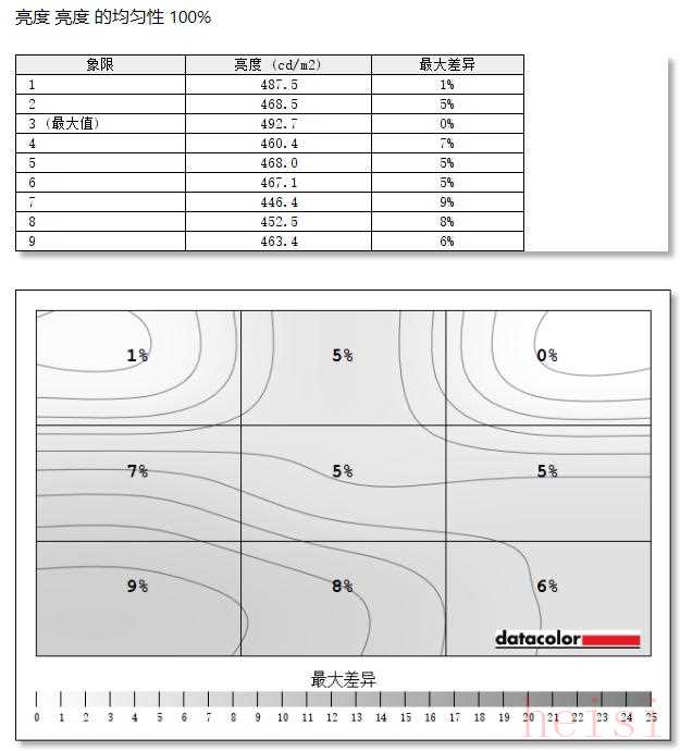 亮度均匀性的测试中,HKC UG25EF显示器整体表现也很优秀,亮度最大为第3象限,最大差异在第7象限,差值为46.3cd/m²。