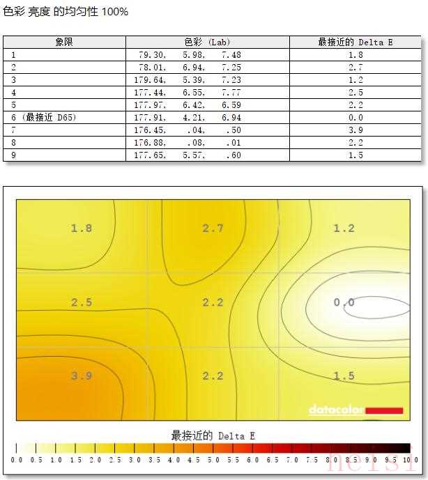在色彩均匀性的测试中,HKC UG25EF显示器的第6象限最接近D65的标准,显示器左边第7象限与标准色温差值最大,不过也只有3.9,整体色彩均匀度表现尚可。