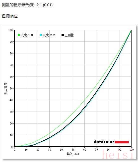 色调响应方面,已测量的黑色曲线应该尽量和浅蓝色的“光度2.2”曲线保持一致,可以看到实测的黑色曲线为2.1和“光度2.2”差距较小,色调响应表现不错。