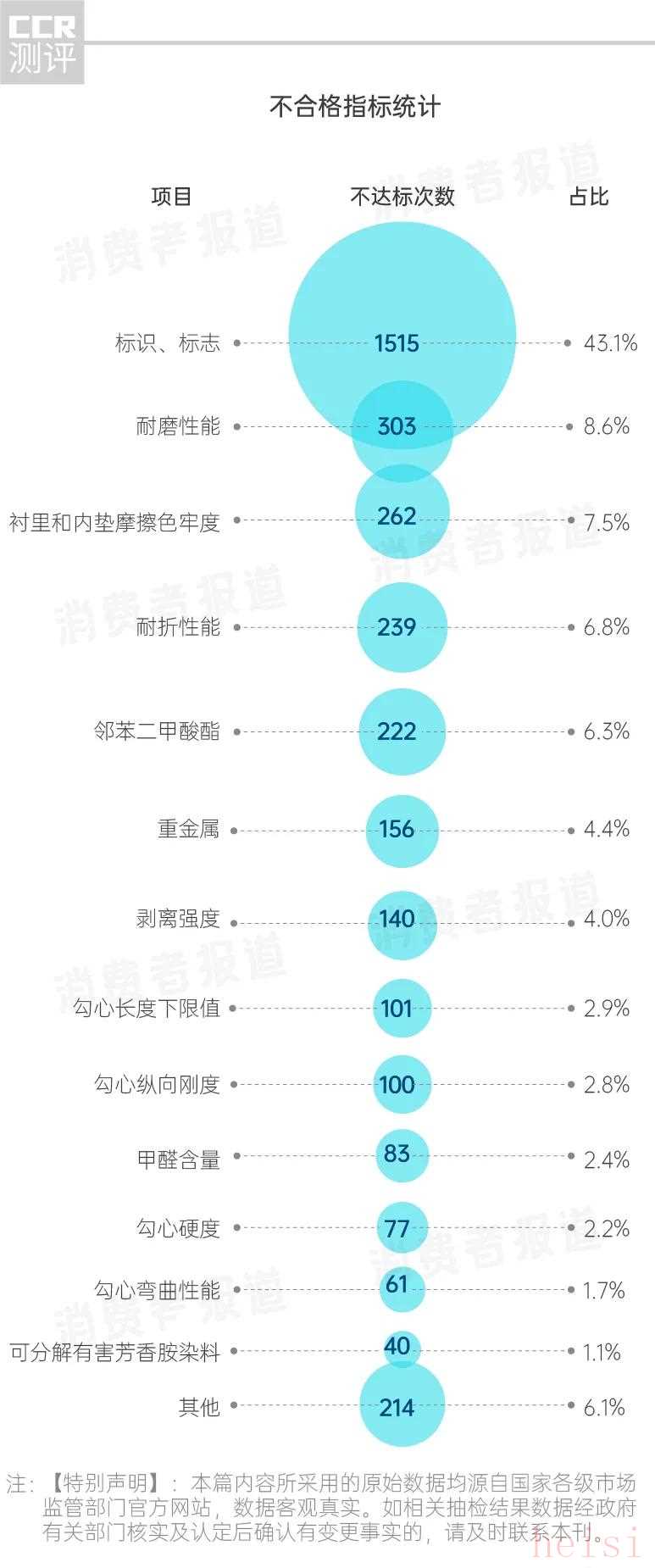 根据抽检数据,标识、耐磨性能、摩擦色牢度、耐折性能、邻苯二甲酸酯等指标不达标情况较突出。