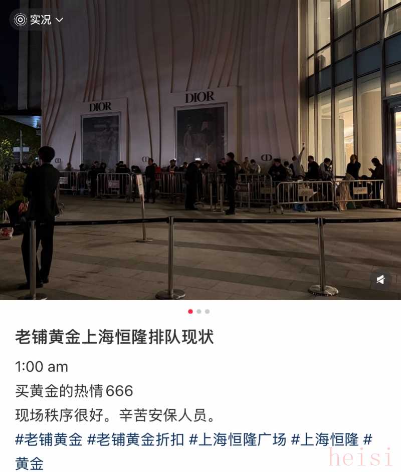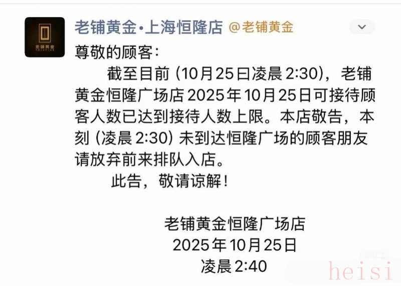 10月25日,重奢地标上海恒隆广场迎来了中国本土品牌老铺黄金。社交平台多位用户表示,本来准备早上6点出发去排队,但是发现从24日晚上10点开始,店铺外已经排起长龙。老铺黄金恒隆广场店于25日凌晨2点在店铺外竖立“客满”告示,同时于2点30分发布公告,表示当天可接待顾客人数已达到上限,凌晨2点30分前未到达恒隆广场的顾客请放弃前来排队入店。