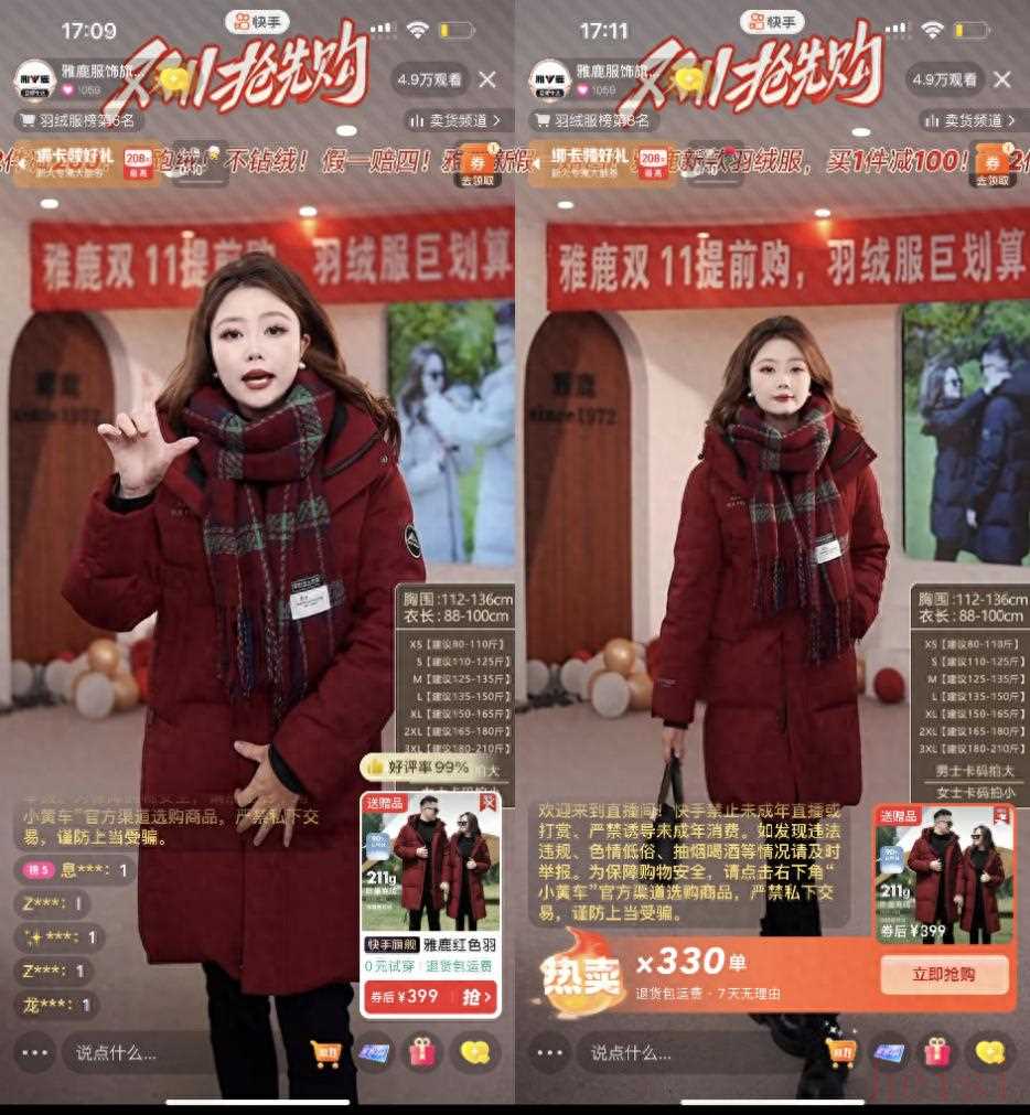 事实上,爆款单品热销离不开雅鹿在备货、运营等方面的系统性投入。大促前,雅鹿已提前储备了充足的羽绒服、防风裤等货品并将库存、打包、发货等动作前置,保证运营效率和用户体验。在此基础上,快手双11开门红期间恰逢全国普遍降温,雅鹿进一步提升开播频次和时长,由原计划一天直播6小时增加至12小时,充分承接降温带来的保暖消费需求。