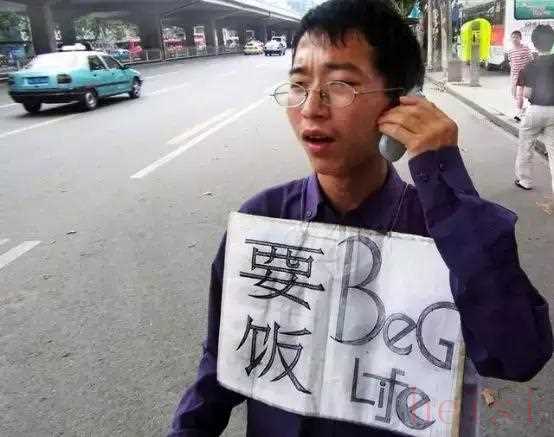 他背着一块写着“要饭beg life”的牌子在街头乞讨,这块中英结合、字体别致的乞丐牌,也像小学课文中巴黎街头那块写着“春天来了,可我什么都看不见”的牌子一样,吸引着路人的关注。