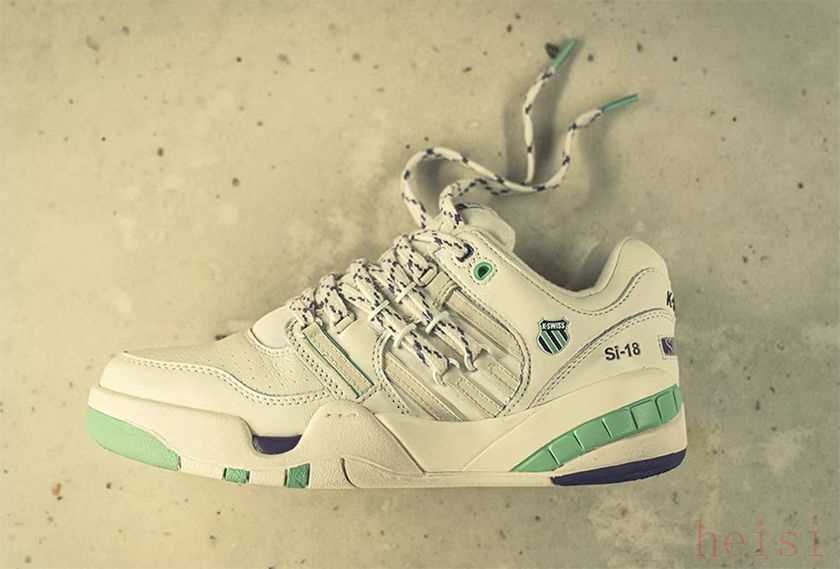 Si-18 International是一款经典网球鞋,具有1990年代复古风格,Stadium x K-Swiss Si-18 International配色以白色为主,搭配较为柔和的紫色和绿色,并配有一个类似原版的吊牌,在上面介绍D-R Cinch系带系统的工作原理。