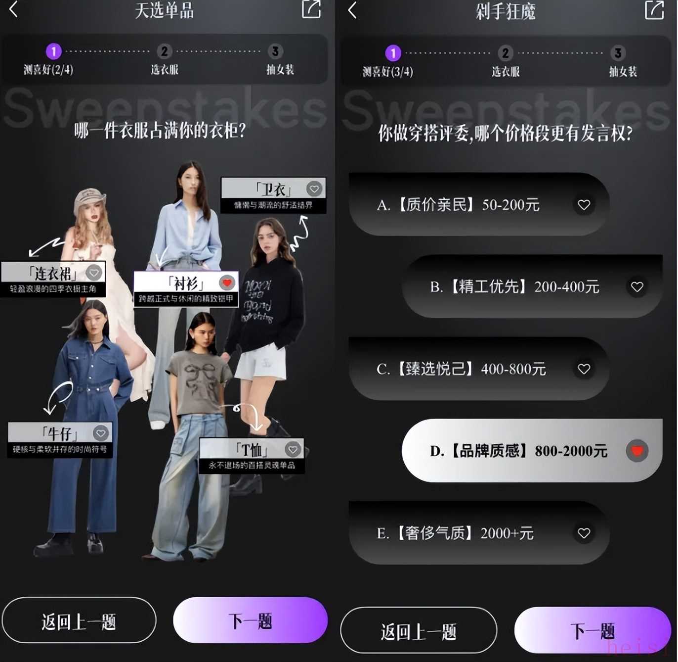 而且值得注意的是,活动设计上也有很多小巧思、小细节。譬如在“答题”环节当中,用户选择自己最喜欢的“明星同款穿衣风格”,算法就会精准匹配对应的单品。通过“做测试题”的模式,可以在很大程度上避免“抽中以后不喜欢”。奖池汇聚了风格化、时尚感的各类单品,几乎可以满足所有人群的穿搭审美与需求。