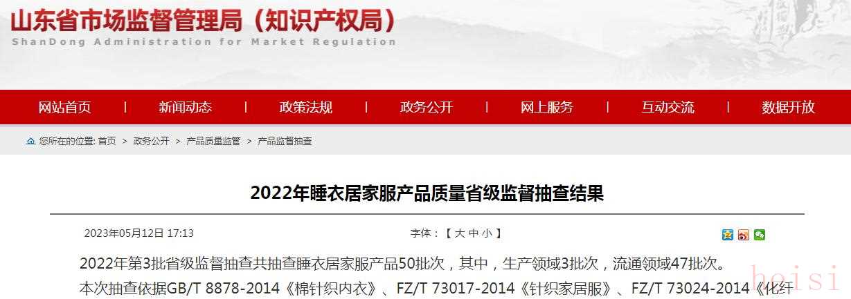 2022年,山东省市场监督管理局分阶段、分类型对家居纺织品进行了监督抽查。例如,在2022年第三季度,就组织了对"休闲服装(含家居服、睡衣)"产品的质量监督抽查。