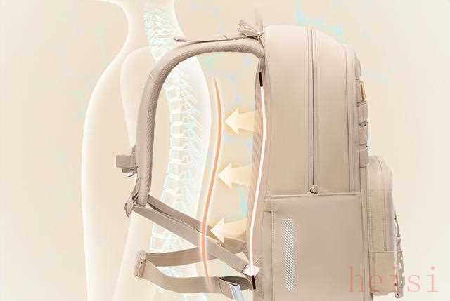 "要点:" 书包的背部需要有加宽、加厚且有良好透气性的设计(如立体导气设计、透气网面)。这可以缓冲背部与书包之间的直接接触压力,并促进空气流通,减少闷热和汗渍,同时提供一定的支撑。