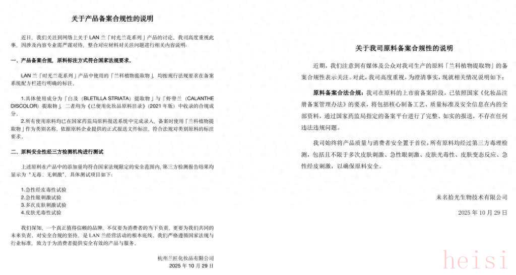 “杭州兰匠化妆品有限公司“发布的“声明”中称,“LAN ”“时光兰花系列”产品中使用的“兰科植物提取物”,均按现行法规要求在备案系统配方栏进行明确的标注。使用成分“白及(BLETILLA STRIATA)提取物”与“虾脊兰(CALANTHE DISCOLOR)提取物”均为《已使用化妆品原料目录》(2021 年版)中收录的合规成分。所有使用原料均已在国家药监局原料报送系统中完成录入,备案时使用“兰科植物提取物”作为类别名称,依据原料企业提供的正式报送文件标注,符合法规对类别原料的标注要求。