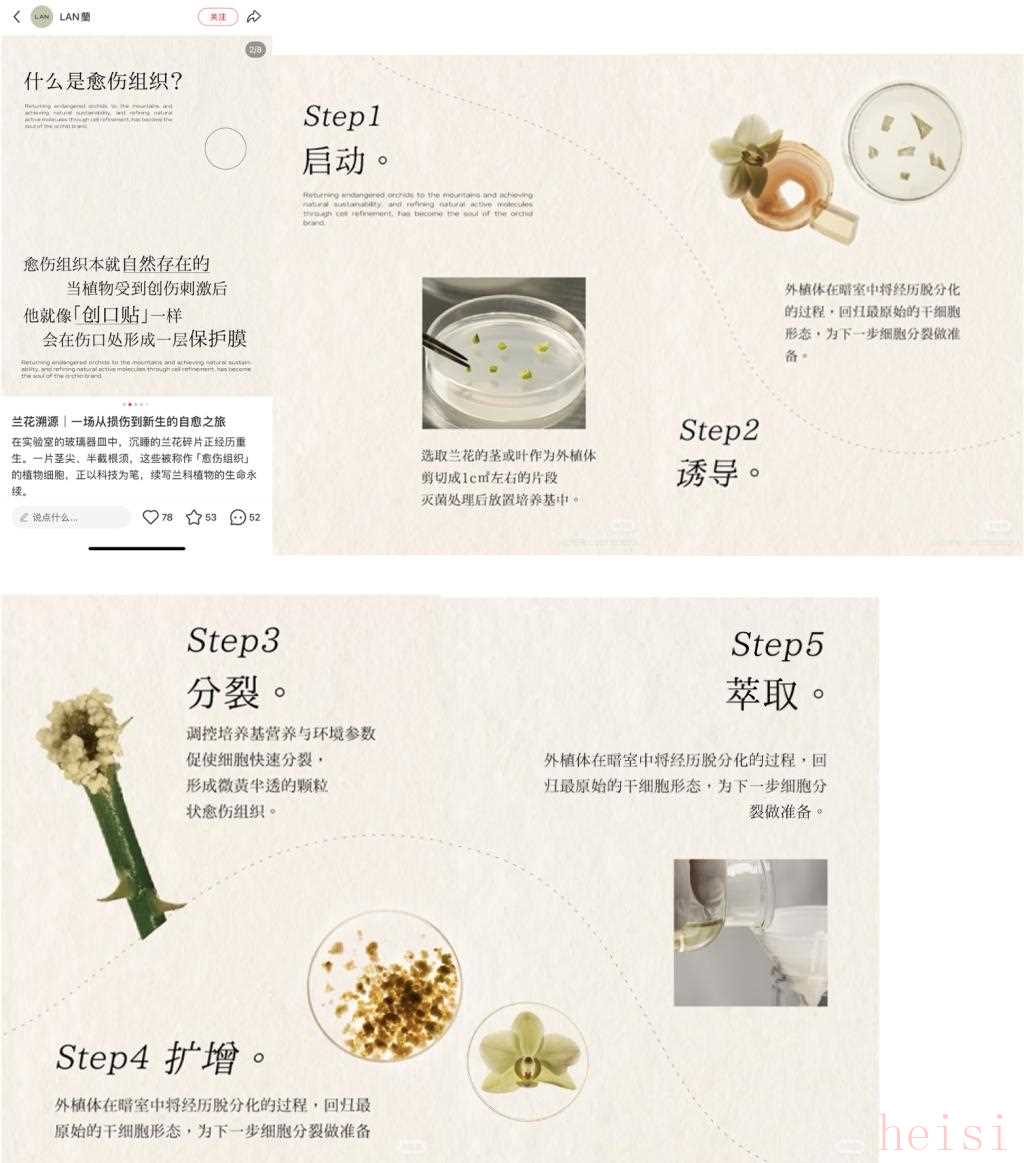 该品牌小红书官方账户曾刊文介绍称,兰花愈伤组织培养是通过提取植物细胞或组织,在无菌环境中诱导其分化为新植株的生物技术。经历诱导、分裂、扩增、萃取等步骤。“把白及的根部碎片放在培养皿中,植物干细胞会不断增殖形成淡黄色像果冻一样的愈伤组织。”
