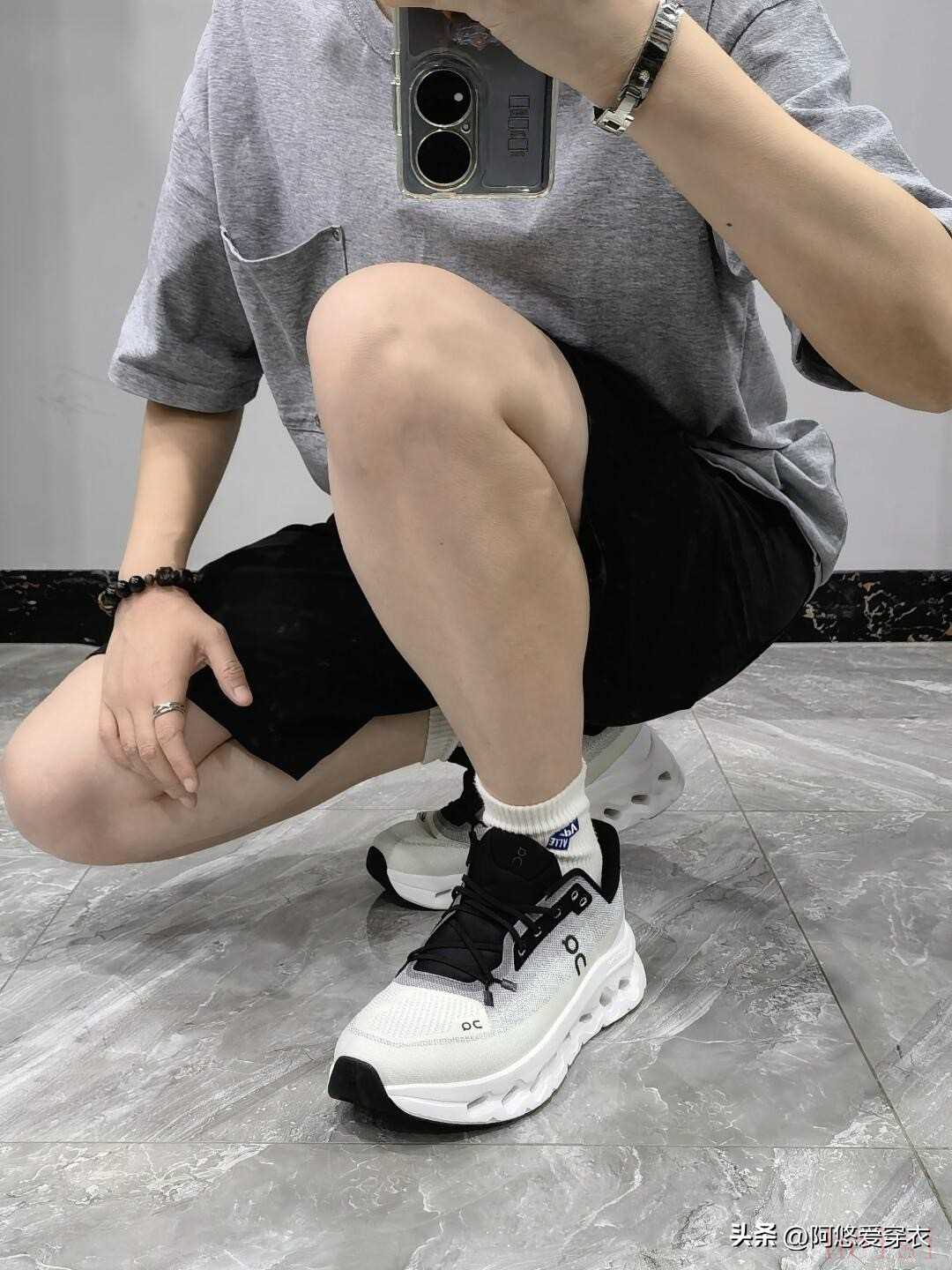 建议大家选十分长度的裤子,刚好覆盖住鞋面且不会拖到地面,不管穿什么袜子都不会露出来,再搭配一双带厚底的运动鞋,增高效果好,比例也能得到优化。