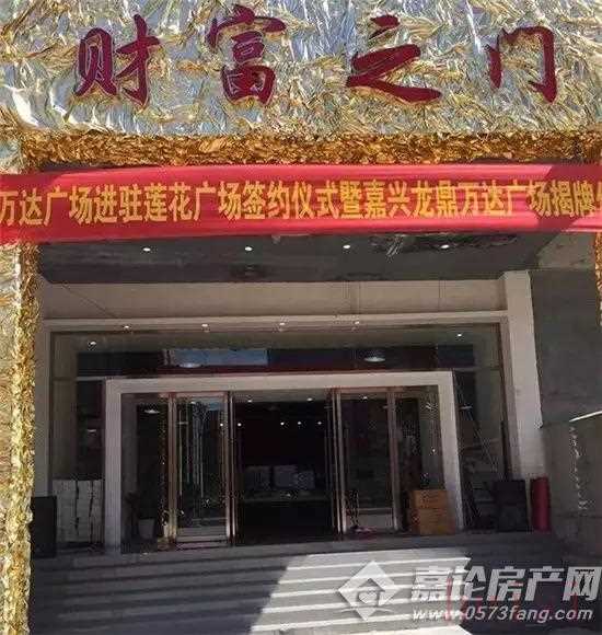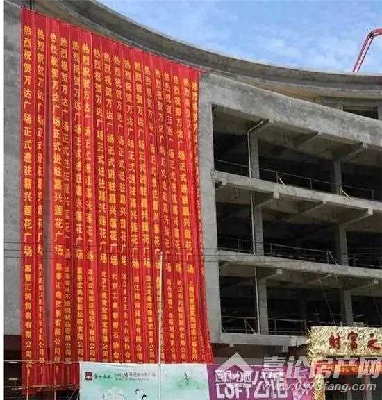 图示地点为嘉兴莲花广场,挂幅上无一例外写着的是恭祝万达广场进驻莲花广场,而项目门头上更挂出了“万达广场进驻莲花广场签约仪式暨嘉兴龙鼎万达广场揭牌仪式”的横幅。