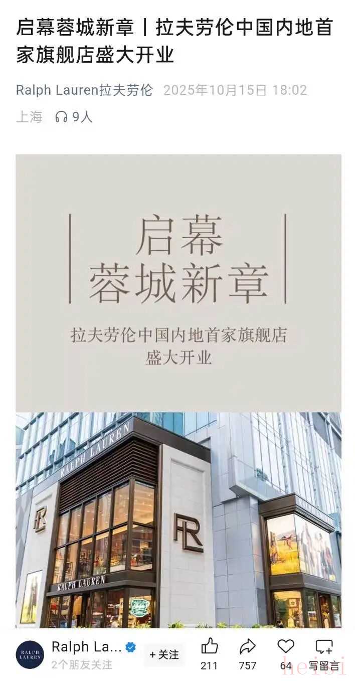 此外,今年10月15日,拉夫劳伦中国内地首家旗舰店盛大开业。爱企查App显示,拉夫劳伦中国关联公司拉尔夫劳伦贸易(上海)有限公司成立于2009年9月,注册资本4300万美元,经营范围包括出版物零售、皮革制品销售、珠宝首饰零售等。