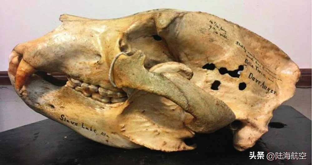 被贝拉·特温打死的棕熊的头骨,一侧仍能够看到多个密集弹孔