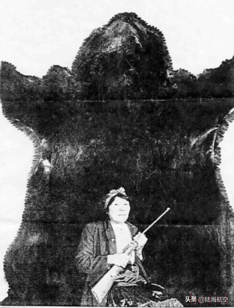 贝拉·特温手持她的“王牌1”单发步枪,坐在被她打死的那头棕熊的熊皮前,两者的体型形成巨大反差