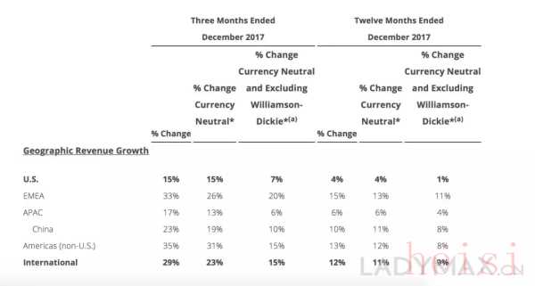 美国地区第四季度销售额上涨15%,全年增长4%;