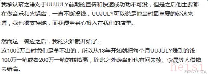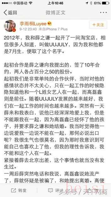 最近的娱乐圈似乎被薛之谦承包了,刚刚与前妻高磊鑫高调宣布复合,昨晚网红李雨桐又发微博长文,称她曾与薛之谦合伙开淘宝店“UUJULY”,取这个名字是因为她和薛都是七月出生,却遭遇遭薛之谦“骗财骗感情”,从2013年开始把每个月UUJULY赚到的钱作为“离婚费”转给高磊鑫。