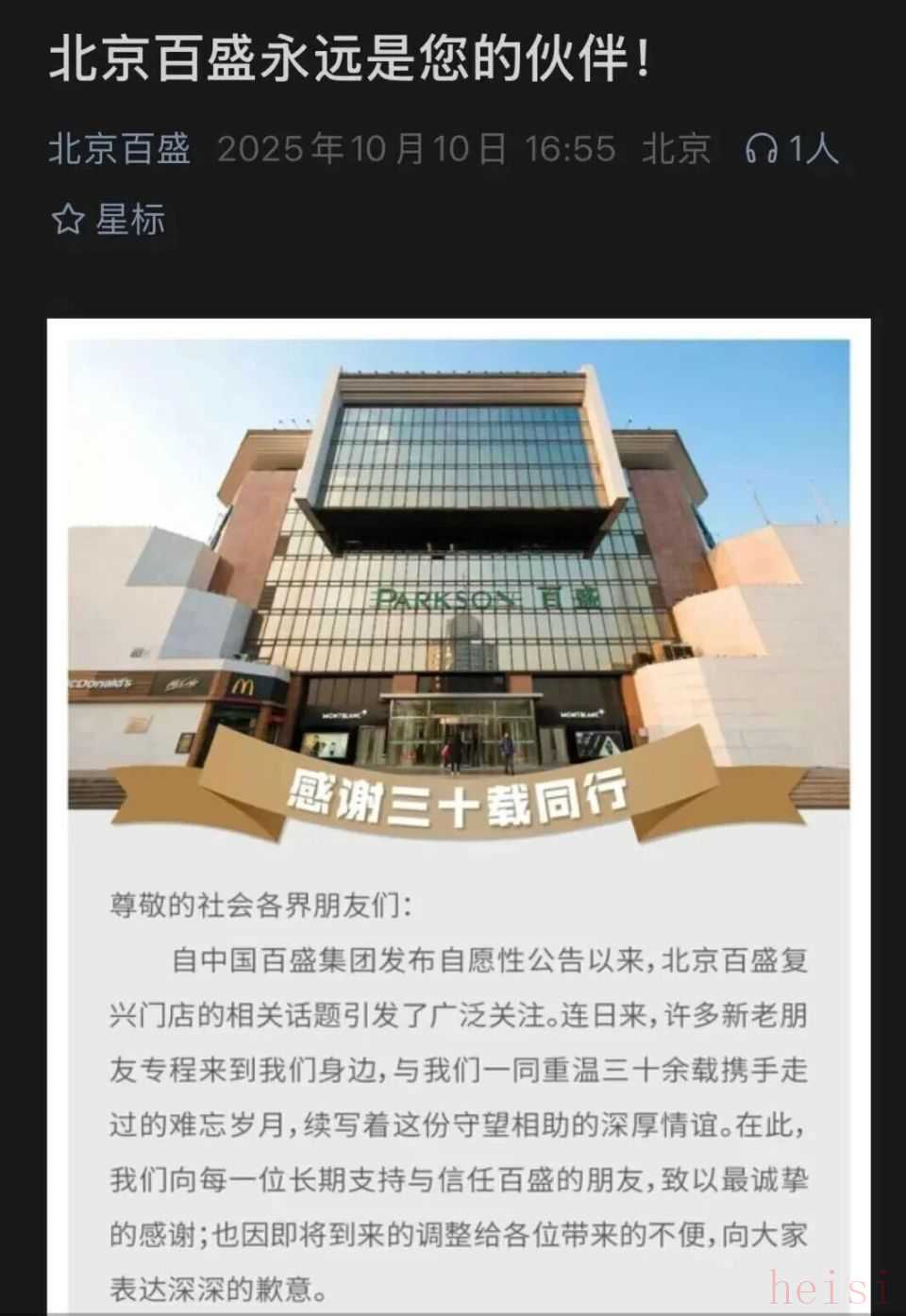 10月10日,北京百盛在公众号发布公告称,百盛集团正全面推进一场积极而全面的战略转型,对于受限于客观条件、难以在复合需求上实现均衡发展的门店,经过慎重评估,将于2025年12月31日关闭北京百盛复兴门店。
