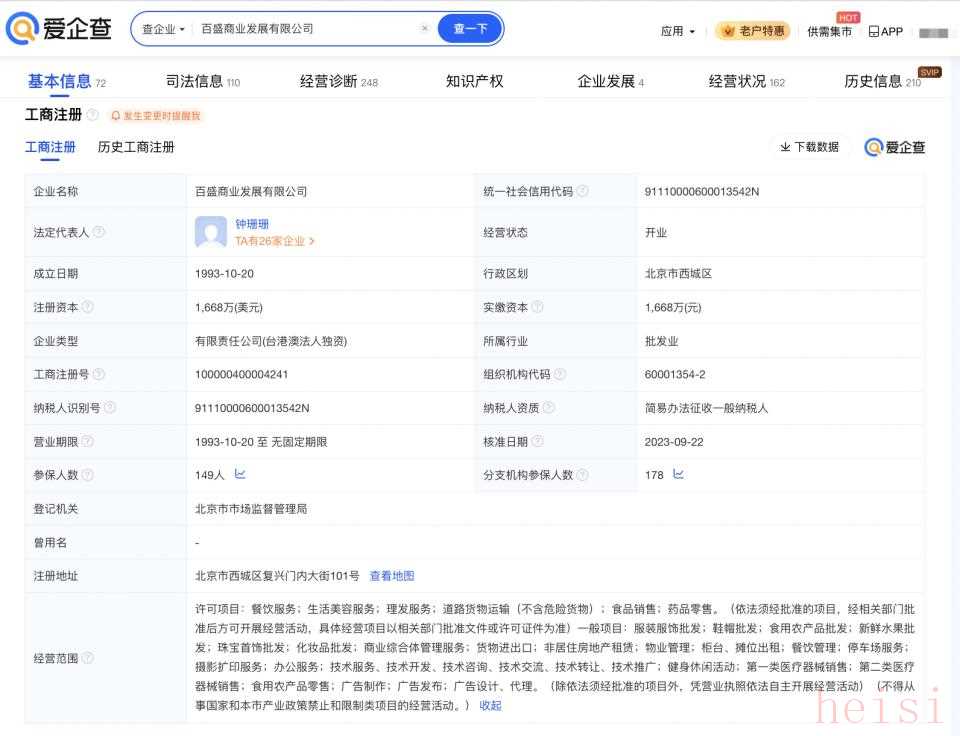 爱企查App显示,百盛商业发展有限公司成立于1993年10月,法定代表人为钟珊珊,注册资本1668万美元,经营范围包括餐饮服务、生活美容服务、理发服务、食品销售等,由Malverest (Hong Kong) Limited全资持股。