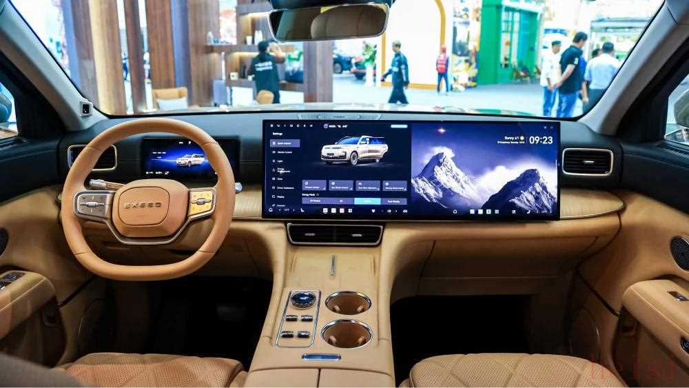 Exeed ET8的内饰采用2+2+2的六座布局,配备11个安全气囊,包括一项专利设计——第三排座椅靠背与后备箱之间的“窗帘”。中控台配备了一个30英寸的6K分辨率显示屏,第二排乘客则可以享受一个17.3英寸的显示屏。