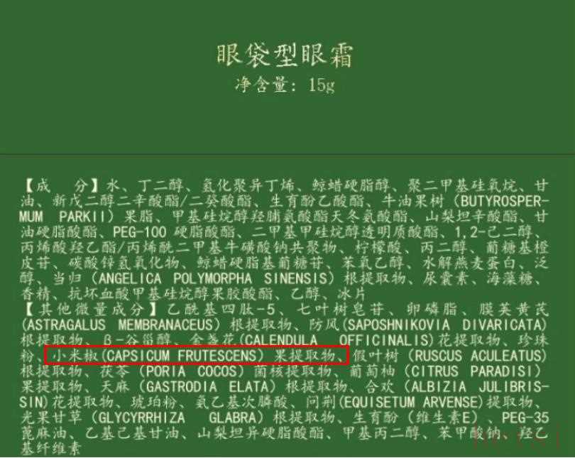 原来,这款丰唇蜜被发现在成分中添加了“小米椒(CAPSICUM FRUTESCENS)果提取物”。不仅是唇蜜,小米椒果提取物还添加在部分品牌的眼霜中,如老字号马应龙八宝的眼袋型眼霜、焕白提亮眼霜等热销产品中也含有该成分。