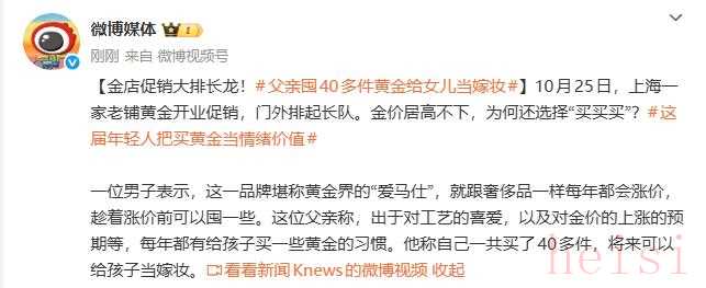 据媒体报道,开业当天,一位父亲围了40多件老铺黄金给女儿当嫁妆。这位父亲说:主要出于对工艺的喜爱,以及对金价上涨的预期等,每年都会给孩子买一些黄金的习惯。