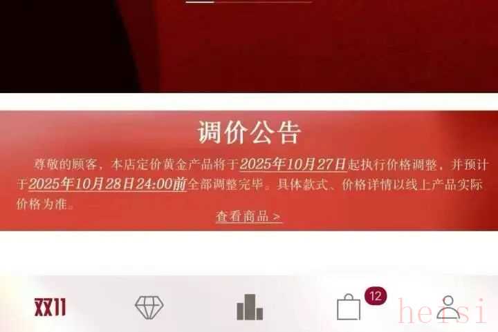 本周三,周大福天猫旗舰店发布了调价通知:本店定价黄金产品将于2025年10月27日起执行价格调整,并预计于2025年10月28日前全部调整完毕。