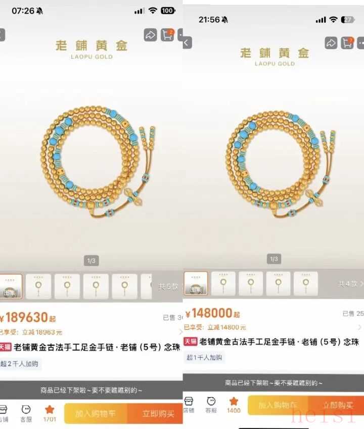 一夜涨了4万多元的108念珠,也是老铺黄金最火的一款产品之一。一条念珠102克左右,从此前的148000元涨到了189630元,涨幅为28%左右。而就在年前,同样一条念珠的公价为9万元左右,一年时间涨了近10万元。