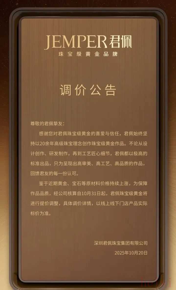 另外一黄金珠宝品牌君佩也即将在月底完成新一轮涨价。这也是君佩在今年的第三次全线涨价,上一轮提价是9月25日,最高涨幅21%。