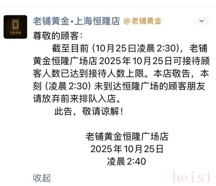 老铺黄金上海恒隆店不得不在凌晨2点40分通过企业微信号发出敬告:截至10月25日凌晨2:30,老铺黄金恒隆广场店10月25日可接待顾客人数已经达到接待人数上限。