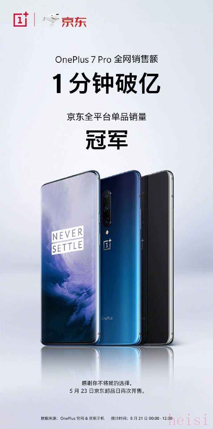 随后的5月21日,一加7 Pro正式首销,该机顶配版接近5000元,仅用时1分钟全网销售额便突破了1亿元,并成为京东全平台单品销量冠军。一加手机创始人兼CEO刘作虎在微博上甚至表示,“已经紧急把发往海外的手机调回国内市场”。