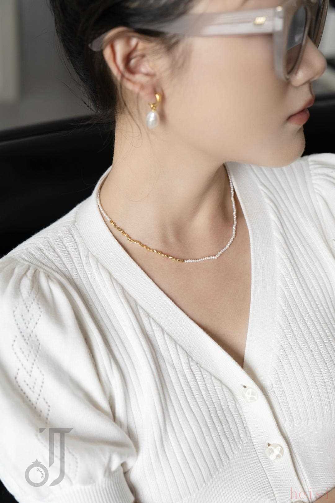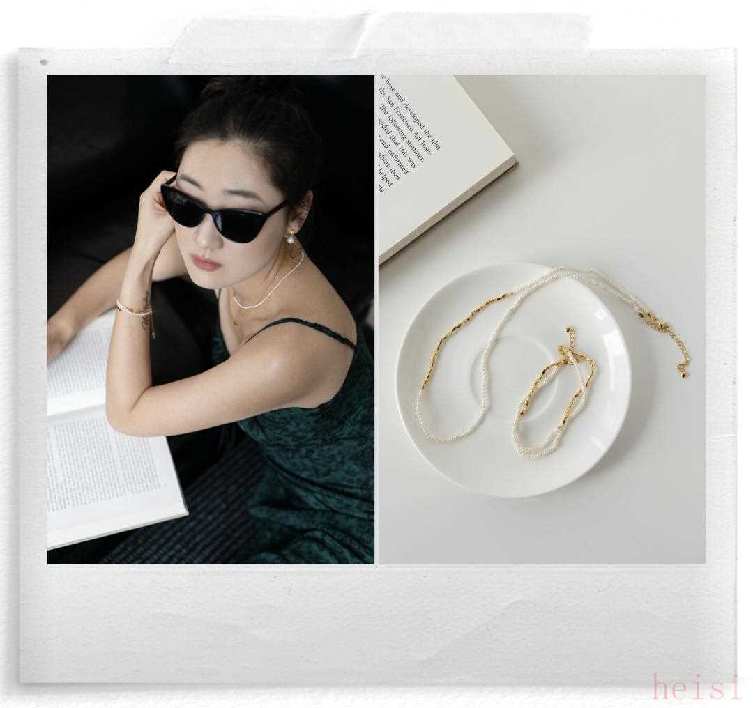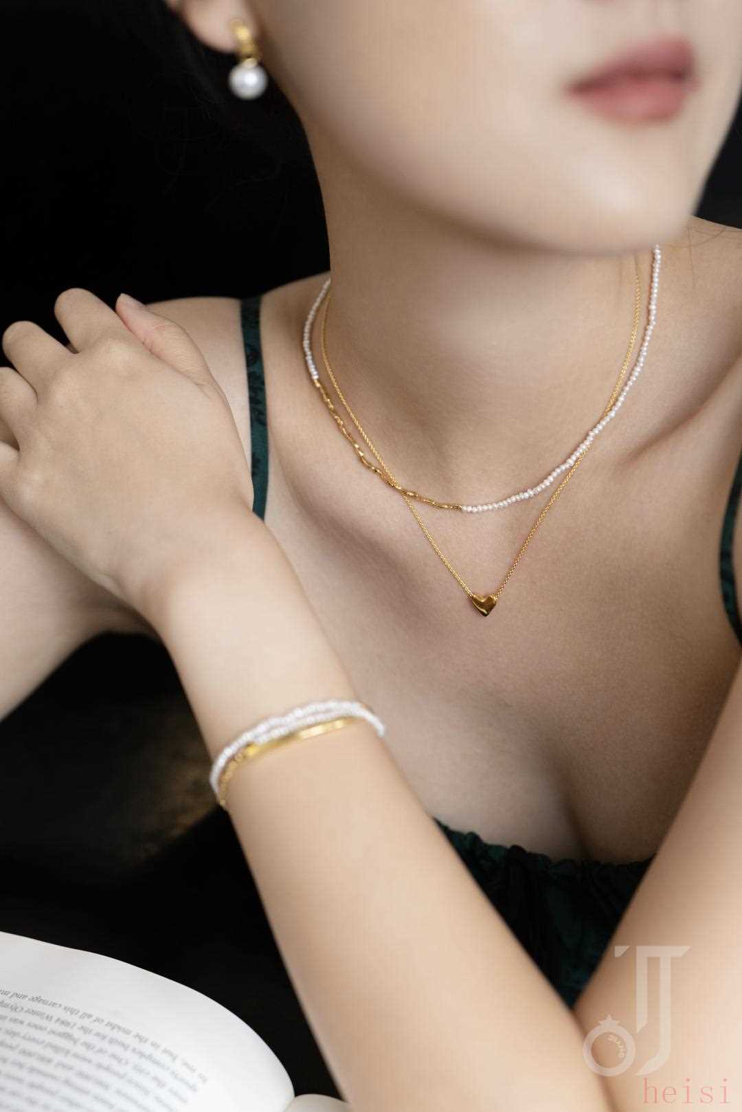 这组项链+手链,都是手工打磨的天然淡水 seed 珍珠串在一起,米粒珠的光泽度很好,是那种小而精的质感,而且「珍」藏爱意这个寓意我觉得作为约会礼物也挺用心的,送朋友的话,看做「珍视友谊」也很棒。