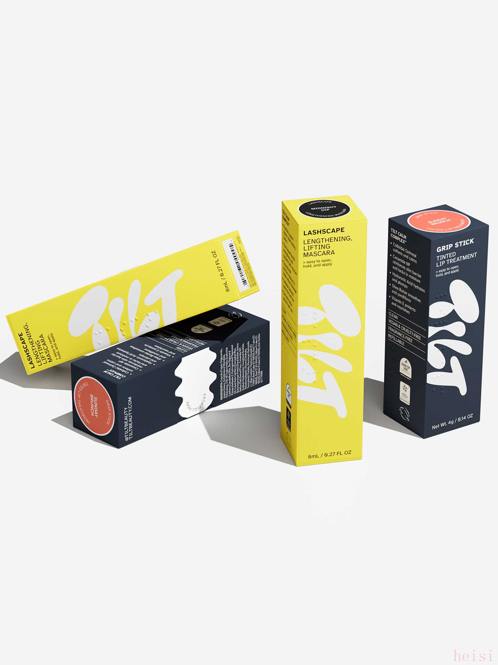 我们是第一个获得关节炎基金会(Arthritis Foundation)易用性认证的彩妆系列,我们花了五年时间来打造这个品牌,这需要我们从头开始重新思考美容产品的包装方式。 我们被要求创建一个新的美丽的人体工学化妆品品牌,专门设计用于各种身体挑战的人群,从慢性疼痛到视力低下的人都能使用,但仍能受到所有人的喜爱。对于慢性疼痛患者来说,大多数美容工具和包装根本不起作用,通常需要使用粘性带、橡皮筋等小窍门,或者干脆跳过化妆步骤。很少有品牌涉足这个领域,而且那些做到的往往在追求实用解决方案时牺牲了美观。在打造Tilt时,我们希望制造出既“舒适”又美观的产品。纯素的, cruelty-free makeup易于开启、握住、阅读和涂抹,且包装大胆、有趣且华丽。产品的开发经过了严格的测试,与国家关节炎基金会以及创始人Aerin Glazer(她本身就是关节炎患者)合作进行。 标志设计为摇晃、不完美但仍美丽的状态,反映了品牌的信条:美丽是属于每个人的,不应该有人被排除在外。二级包装有大标签撕条,便于开启,并且有美国盲文协会的盲文产品描述。我们还在整个品牌中使用了盲文协会的Atkinson Hyper-Legible字体,使低视力者更易阅读。 主包装是硅涂层的,为了实现柔软和抓握力,这些弧形设计特别为手指提供了一个完美放置的凹槽,特别考虑了握力较弱的人。睫毛膏棒显著短于标准长度,因为我们将标准睫毛膏棒的长度发现会加剧颤抖手的人的不稳定感,从而影响准确涂抹。通过缩短睫毛膏棒,这个问题得到了显著解决。每个产品都可以重新填充,并且重新设计了替换装,以便于更换。结果是,每个替换装的底部都配有一个专利的花形茎,可以插入产品的底部,使您可以轻松推出而无需抓握。替换装上还有一个显示色调的贴纸。这样用户就不需要打开产品来查看颜色。这是一个对各方都有利并解决了许多可再填充产品常见问题的解决方案。主外壳也配备了磁铁,以减少开启和关闭所需的力。最后,该品牌与Pack Collective合作,以便于回收。