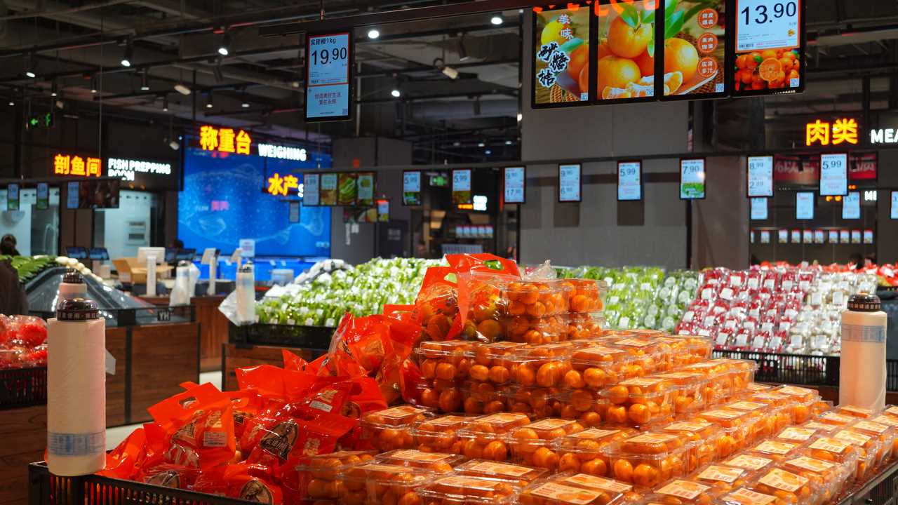 卖场取消了强制动线,把过道拓宽到2米,中岛货架高度统一降至1.6米。生鲜区、休闲食品区、日用品区等区域划分明确,标识更清晰。
