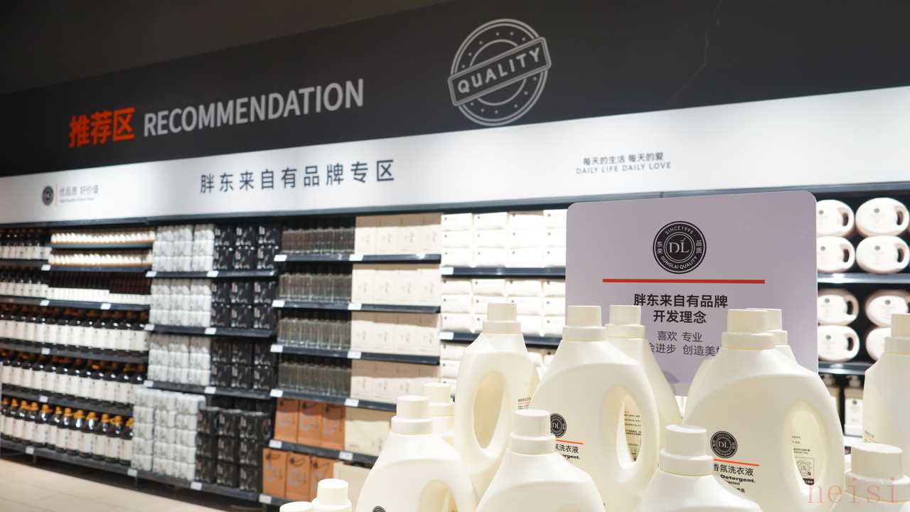 门店还专门设置了“胖东来自有品牌专区”。这里陈列着DL饮用天然矿泉水、DL葡萄复合果汁……数十款商品,(“DL”即东来的缩写),消费者在家门口即可买到这些网红商品。