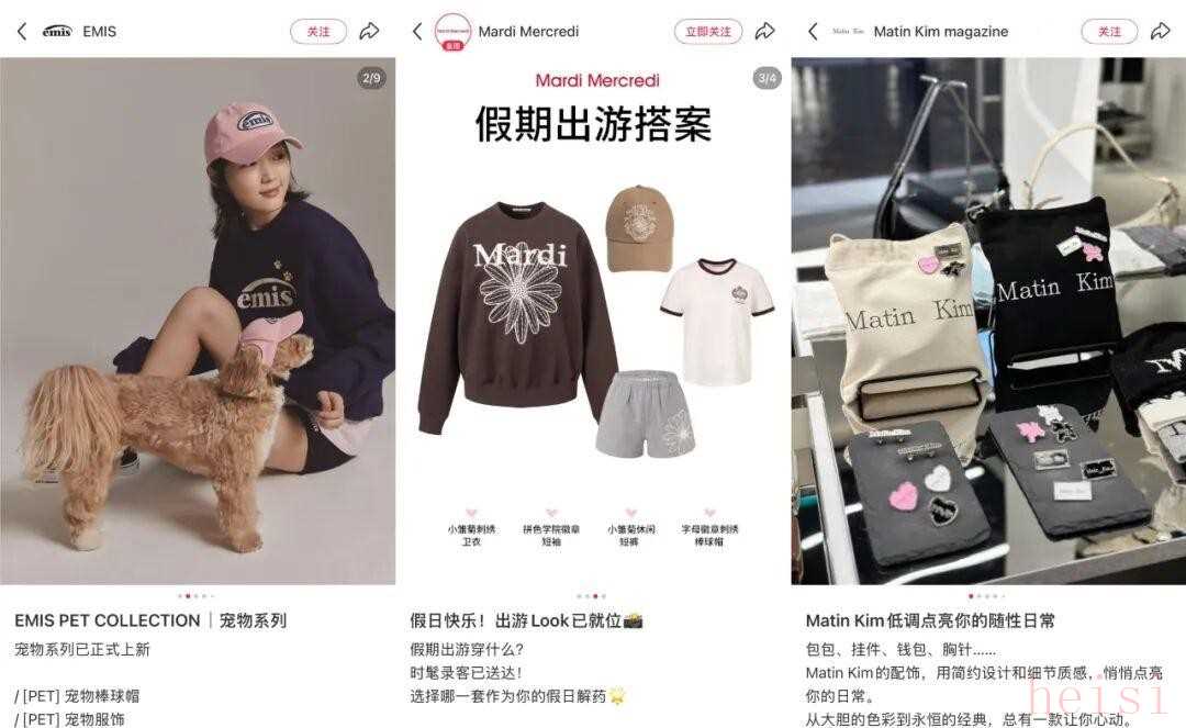 产品策略展现出明显的风格分工。Mardi Mercredi把一朵小雏菊和一条腊肠狗放在胸前,形成容易识别的爆款图案,走的是“主打印花+松弛感”的路线。emis以棒球帽为核心单品,走极简美式复古路线,帽型能修饰脸型,被称为“街帽”代表。Matin Kim侧重有设计感的通勤单品,包和外套以细节和板型吸引对通勤有要求的消费者。品牌在渠道上把明星光环、社交推荐和可触达的价格组合在一起,形成短时间内拉动销量的闭环。
