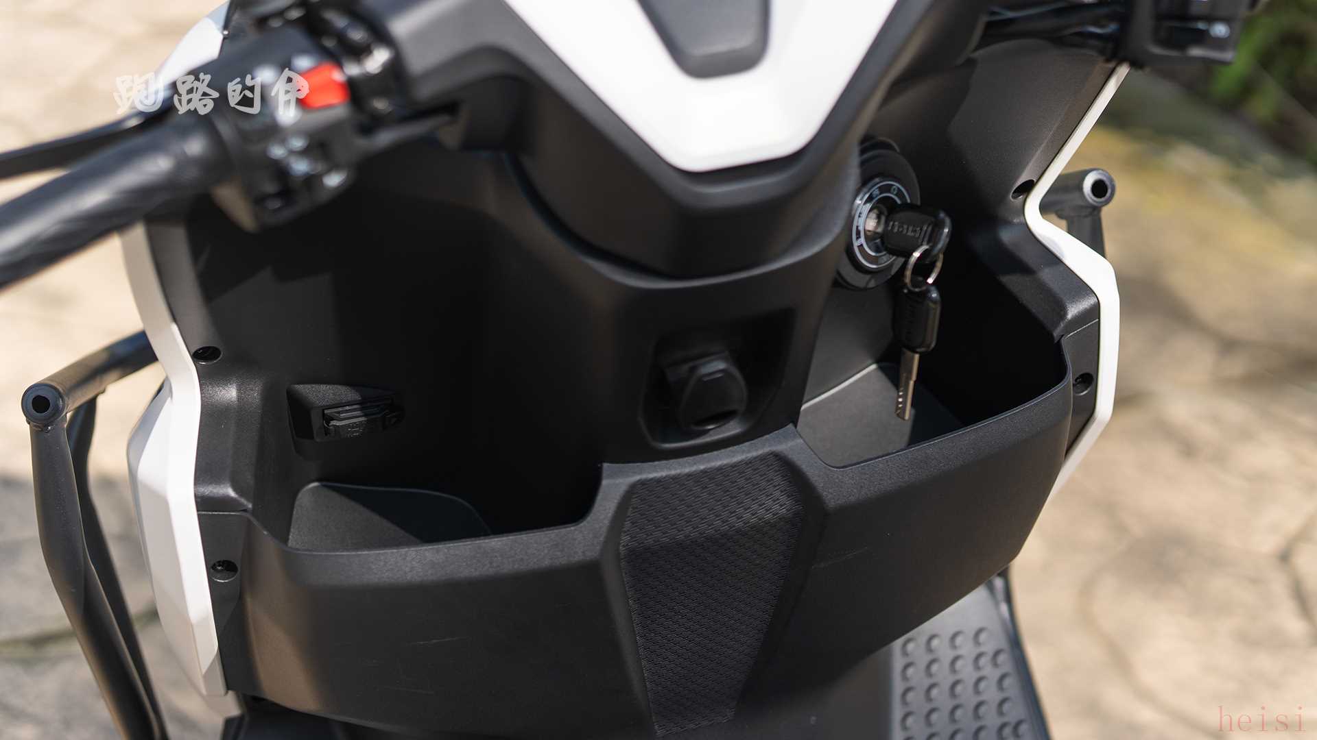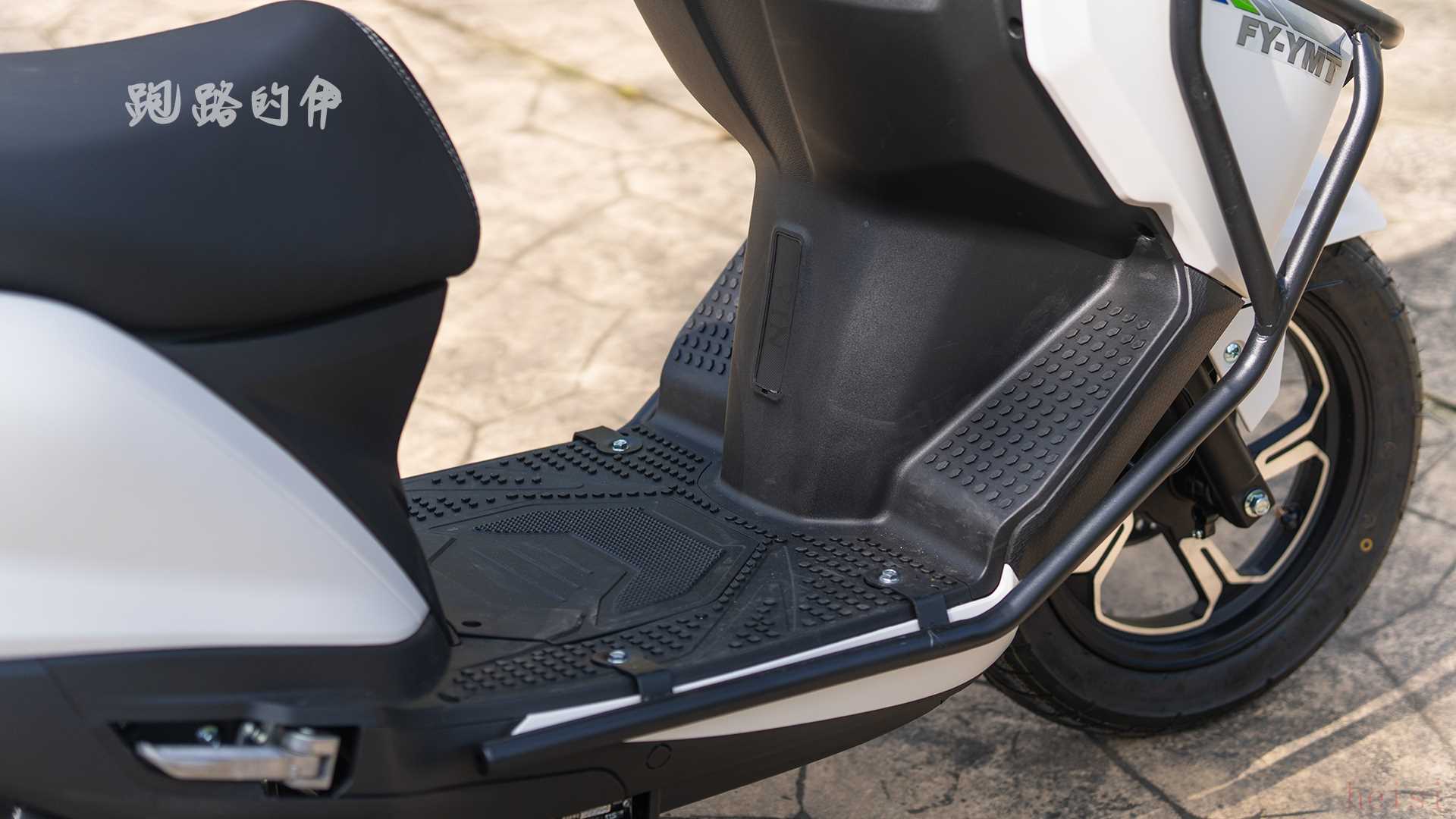 整车裸车状态就很有装载能力,前方有着左右两个很大的开放式储物盒,各能放下三瓶500ml水的,中间还有中置的挂钩,非常实用。而中间脚踏部分最短距离也是有29cm,平踏的面积十分的宽裕,用来载货也是足够用的。出厂自带的尾箱架也是方便加装尾箱来载更多的东西。而且原厂也是给了防摔杠,减少外壳损坏维修的成本。