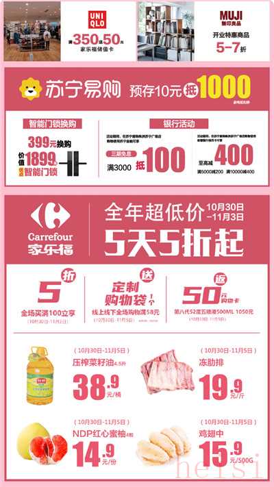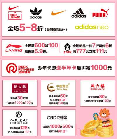 优衣库消费满350元送50元家乐福储值卡,MUJI开业特惠商品5-7折,苏宁易购预存10元抵1000元,家乐福开业5天5折起,NIKE KL、adidas、三叶草、adidas NEO、NIKE 、PUMA等运动潮牌全场5-8折。