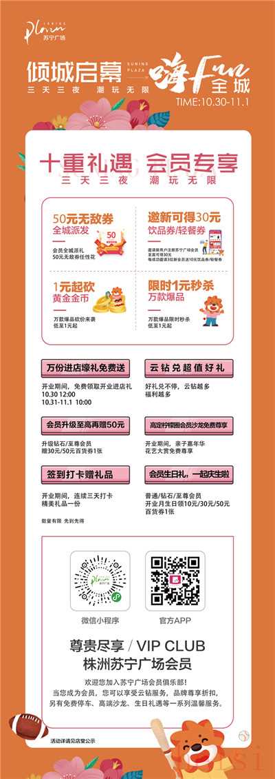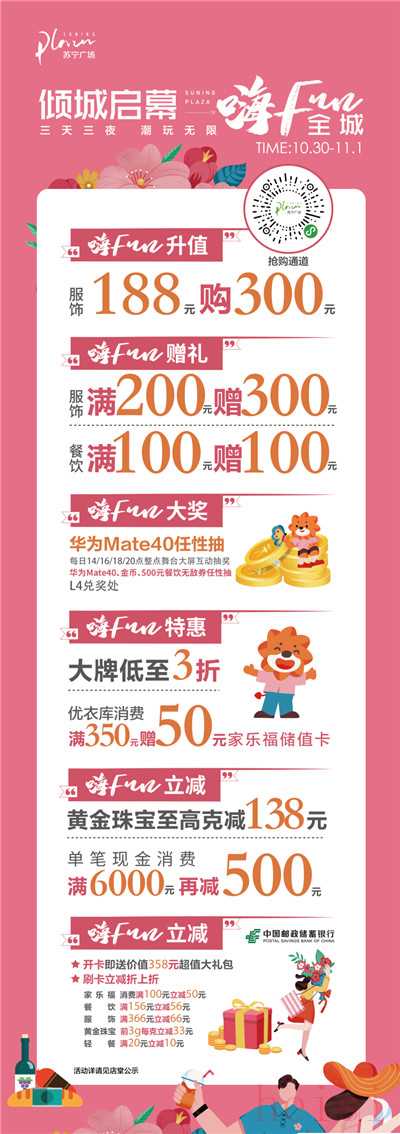 此外,在商家活动基础上,株洲苏宁广场还推出服饰类188购300元升值购、服饰类消费满200元赠300元,餐饮类消费满100元赠100元,黄金珠宝至高克减138元,单笔现金消费满6000元再减500元。此外,苏宁广场APP/小程序还推出万款爆品1元起秒杀、1元砍价超值爆品等活动,回馈广大会员。